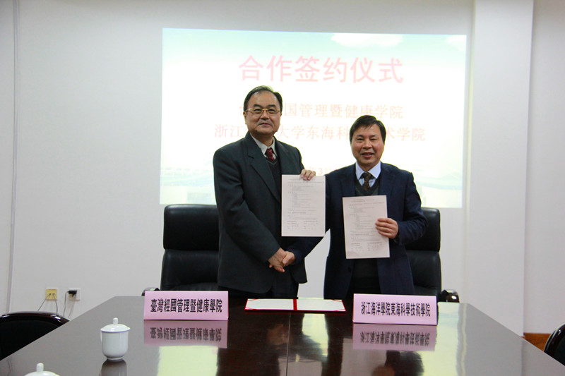 3月10日上午,台湾经国管理暨健康学院董事长蒋初泰、校长邱明源、研发处处长郑俊彬来到浙江海洋学院东海科学技术学院访问交流,并与学院签署合作协议。学院院长王世来、副院长孙瑜,学校继续教育学院院长金永忠等出席洽谈、签约活动。