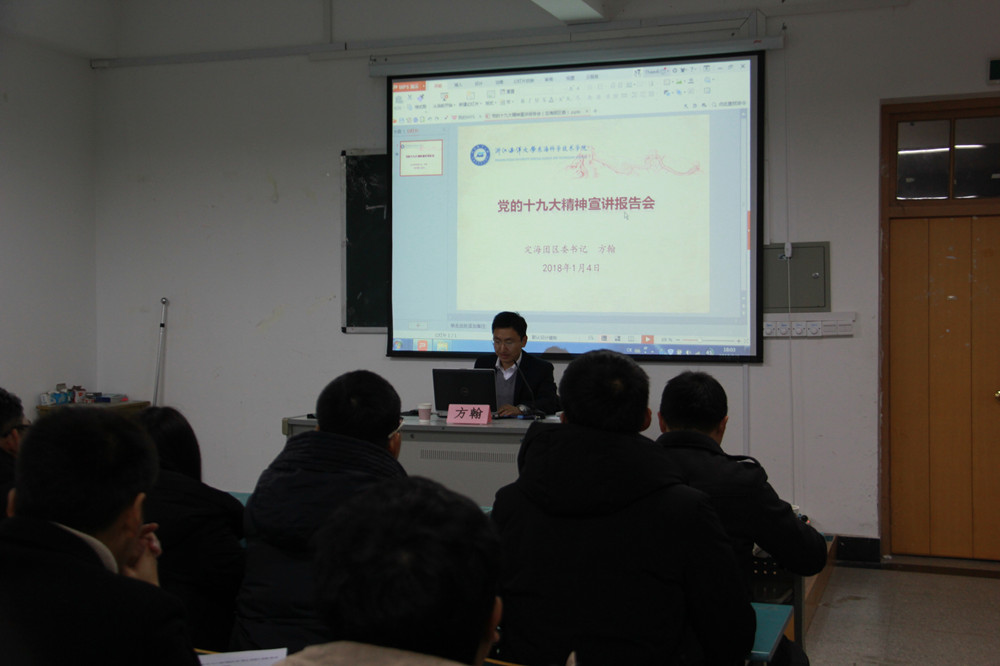 “习总书记在党的十九大报告中指出,人民对美好生活的向往,就是我们的奋斗目标。中国共产党人的初心和使命,就是为中国人民谋幸福,为中华民族谋复兴。”2018年是全面贯彻党的十九大精神的开局之年,1月4日晚,定海团区委书记方翰应邀来浙江海洋大学东海科学技术学院宣讲党的十九大精神,学院团委书记蔡阿雄主持报告会,数百名师生到场聆听了报告。